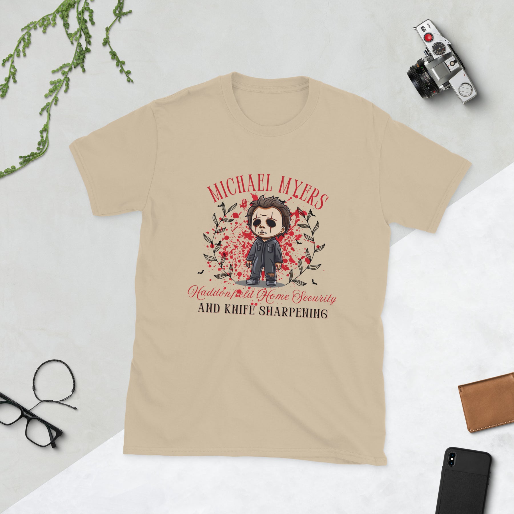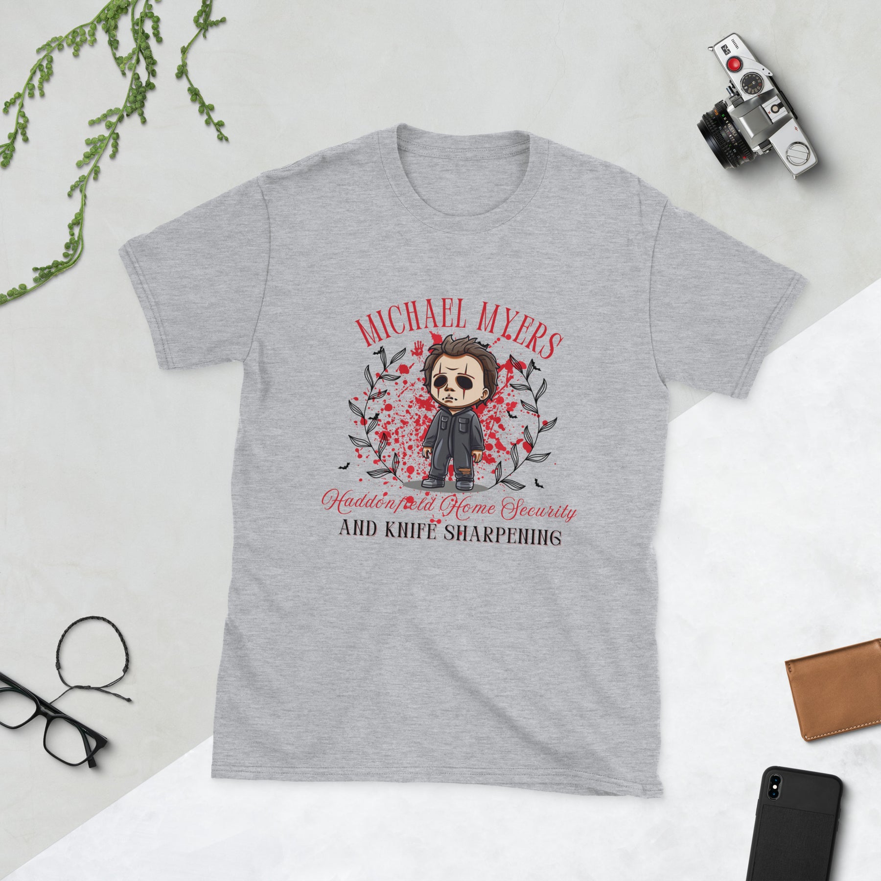 Get into the Halloween spirit with a spooky twist of humor in our Michael Myers: Home Security & Knife Sharpening t-shirt! Featuring a fun cartoon-style graphic of everyone’s favorite horror icon surrounded by fall leaves and eerie vibes, this shirt is perfect for horror movie buffs, Halloween lovers, and anyone who enjoys a good laugh with their fright night fashion.