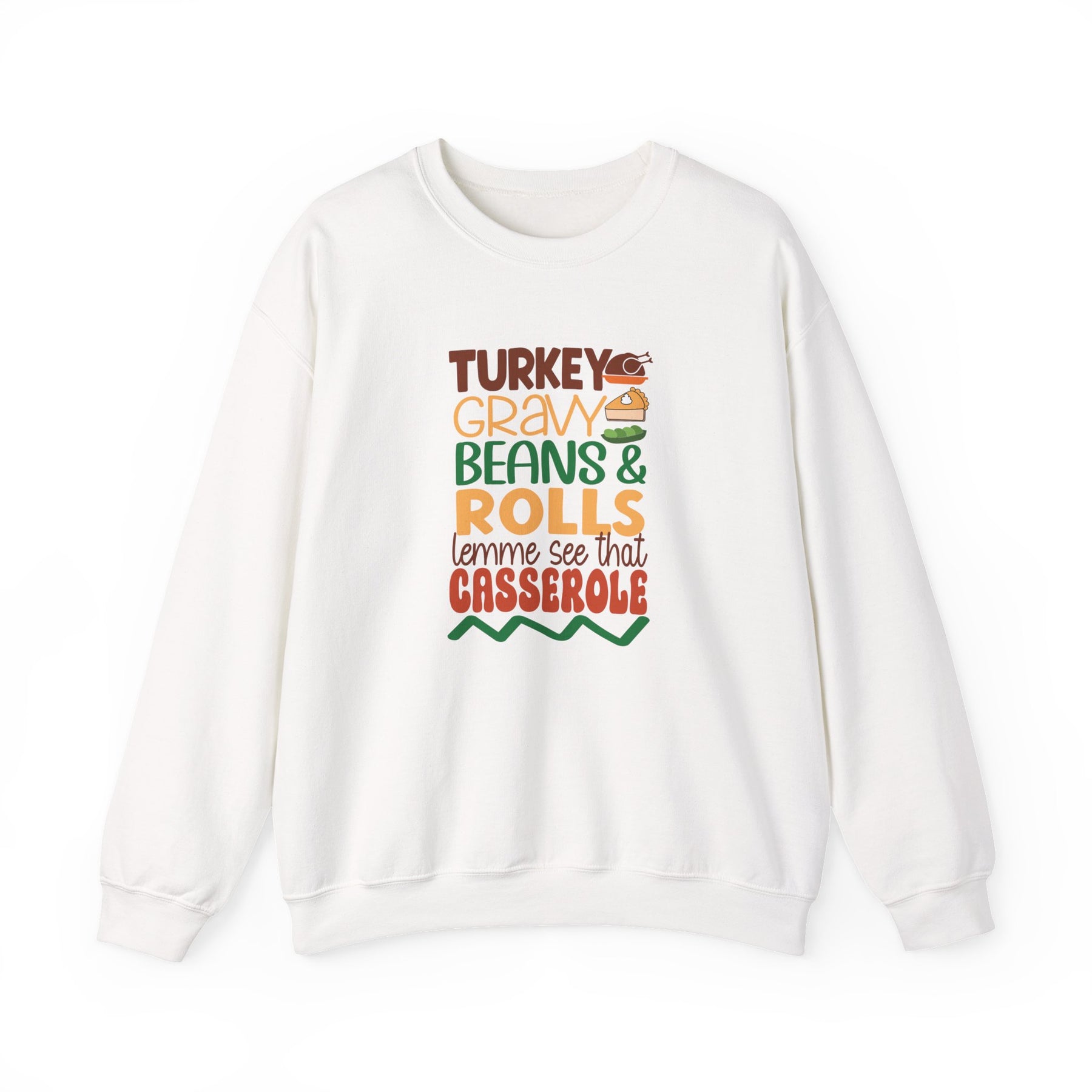 Stay warm, comfy, and full of holiday cheer with this Turkey, Gravy, Beans & Rolls sweatshirt — perfect for Thanksgiving, Friendsgiving, or any fall feast! This cozy crewneck brings all the fun and flavor of the season in one playful design. Ideal for food lovers, dinner hosts, or anyone who believes the best part of Thanksgiving is the food and the laughter.
